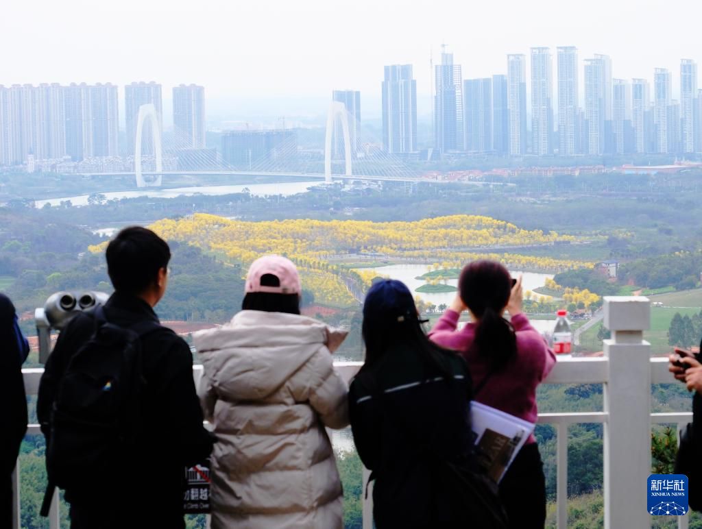 3月19日,游客在广西南宁市青秀山风景区观赏黄花风铃木。新华社