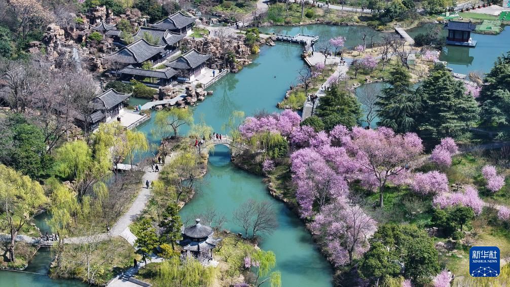 3月19日,游客在江苏扬州瘦西湖风景区踏春赏景(无人机照片)。新华社