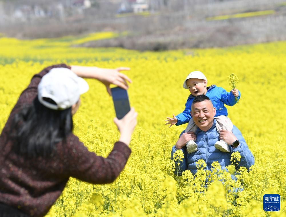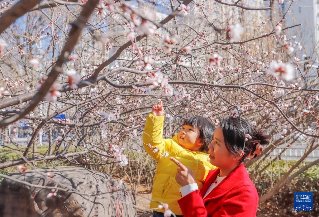 3月19日,家长和孩子在河北省遵化市一公园游玩赏花。新华社