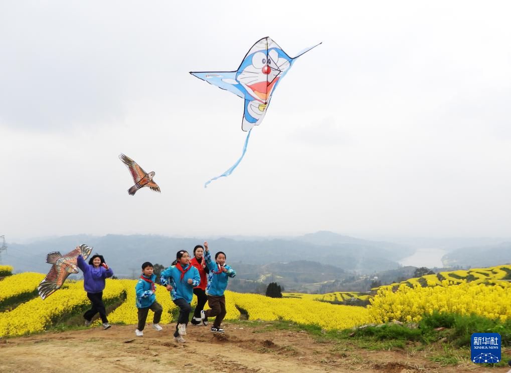 3月19日,四川省达州市达川区龙会乡中心学校学生在放风筝。新华社