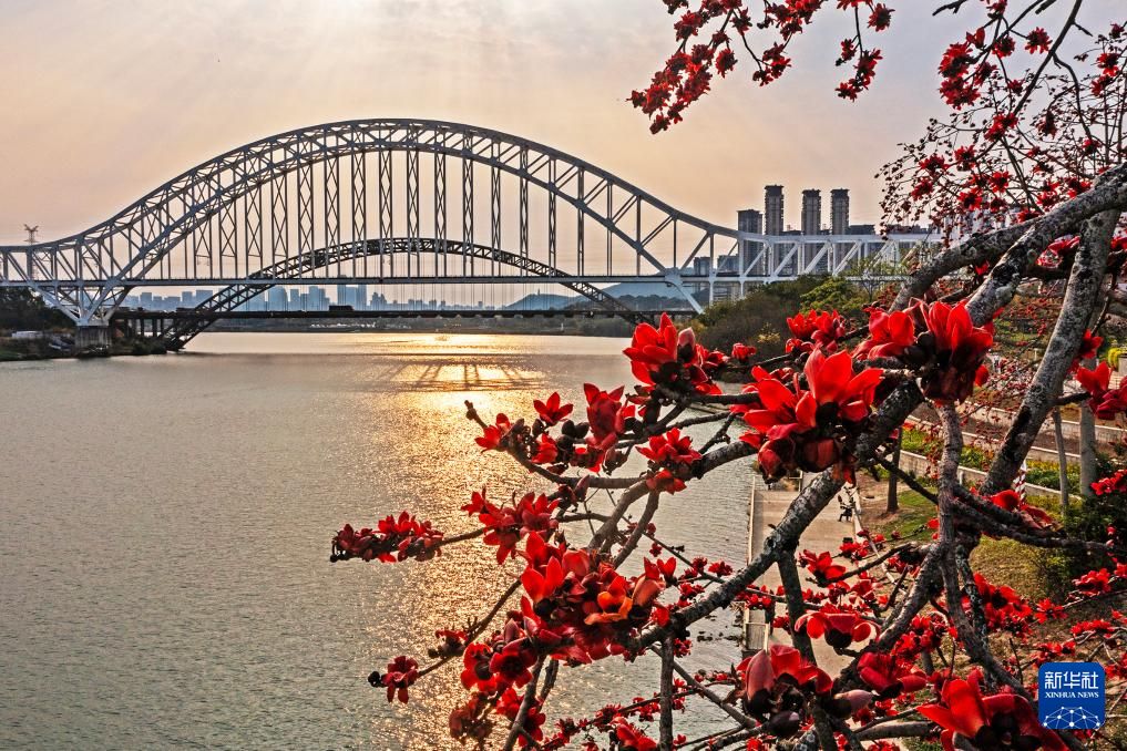 3月18日在广西南宁市邕江岸边拍摄的红木棉(无人机照片)。新华社