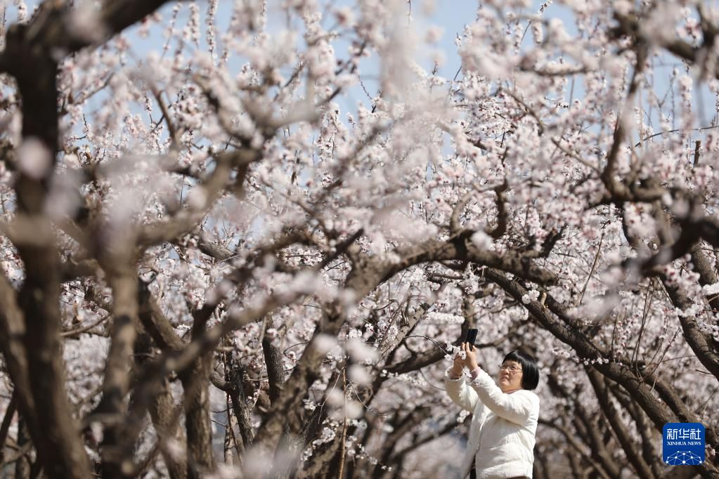 3月18日,游客在河南省焦作市温县北冷乡许北张村杏园里踏青赏花。新华社