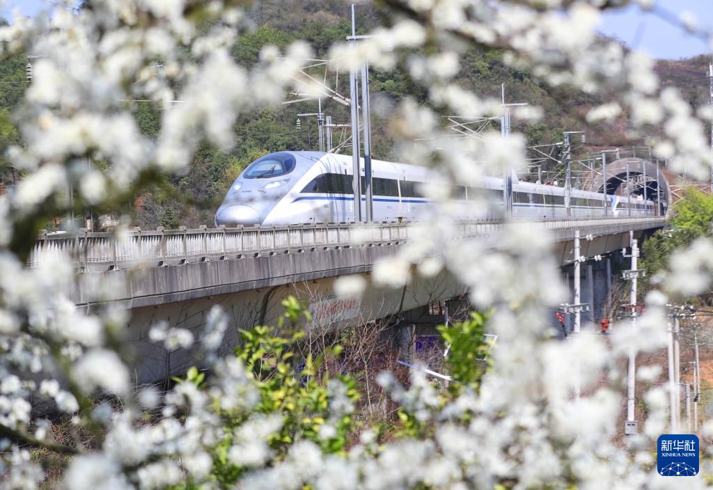 3月19日,一列高铁列车行驶在湖南省衡阳市衡山县萱洲镇春花盛开的田野上。新华社