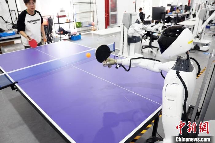 3月20日,在智元机器人张江数据采集中心内,人形机器人正在练习打乒乓球。中新网