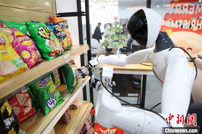 3月20日,在智元机器人张江数据采集中心内,人形机器人正在执行整理货架任务。中新网