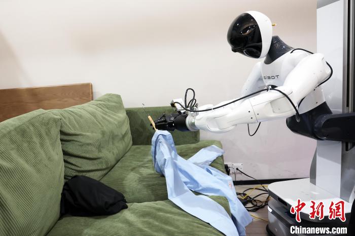 3月20日,在智元机器人张江数据采集中心内,人形机器人正在练习整理衣服。中新网