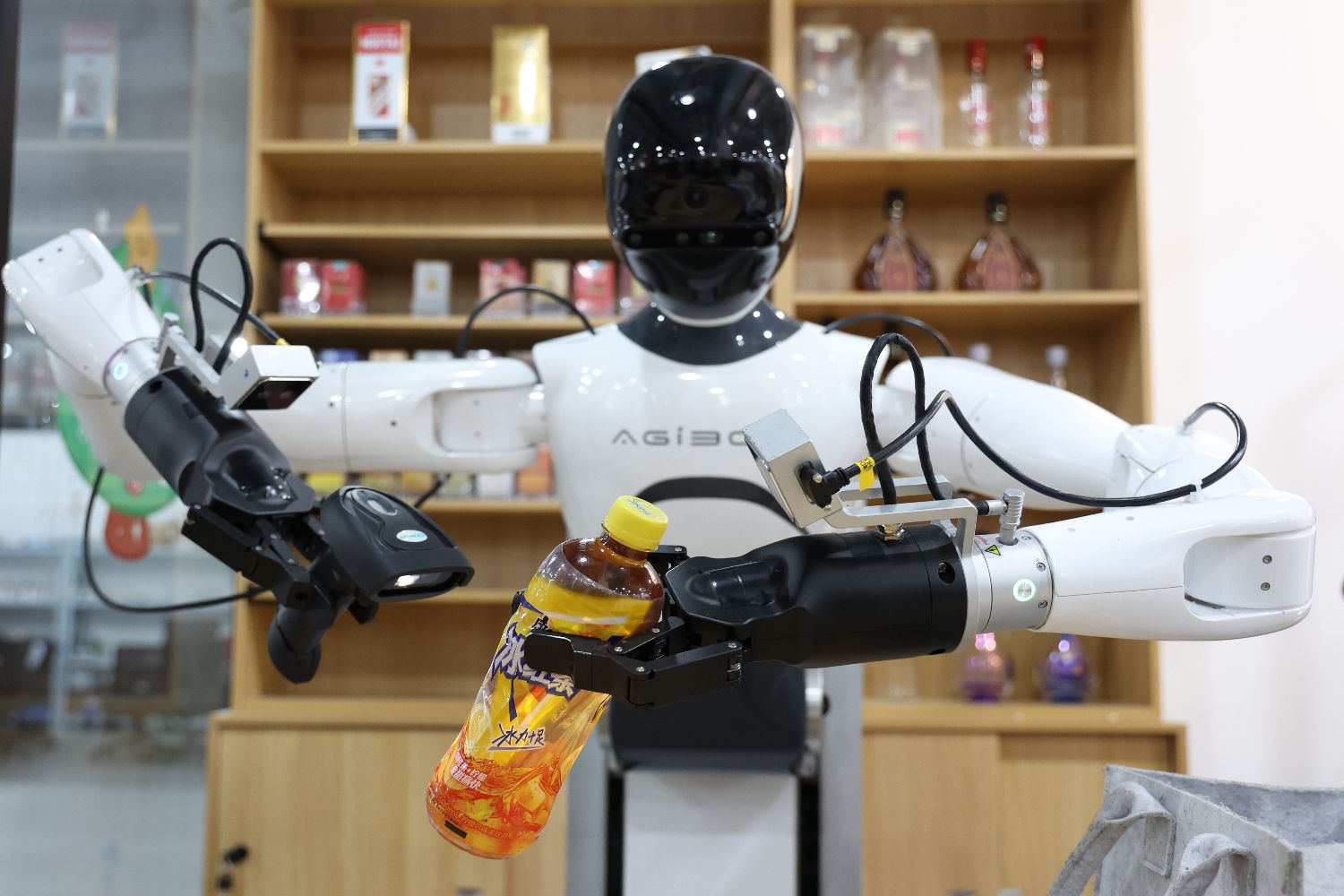 近日,上海首个人形机器人量产企业发布通用具身模型基座:智元启元大模型(GenieOperator-1,简称GO-1)。GO-1好比一款人形机器人的“新大脑”,不仅具备强大的泛化能力,还能在极少的数据支持下快速适应新任务。这使得机器人能够在家庭、办公、商业、工业等多种场景中灵活应用。图为3月20日,在智元机器人张江数据采集中心内,人形机器人执行货品结算任务。中新社
