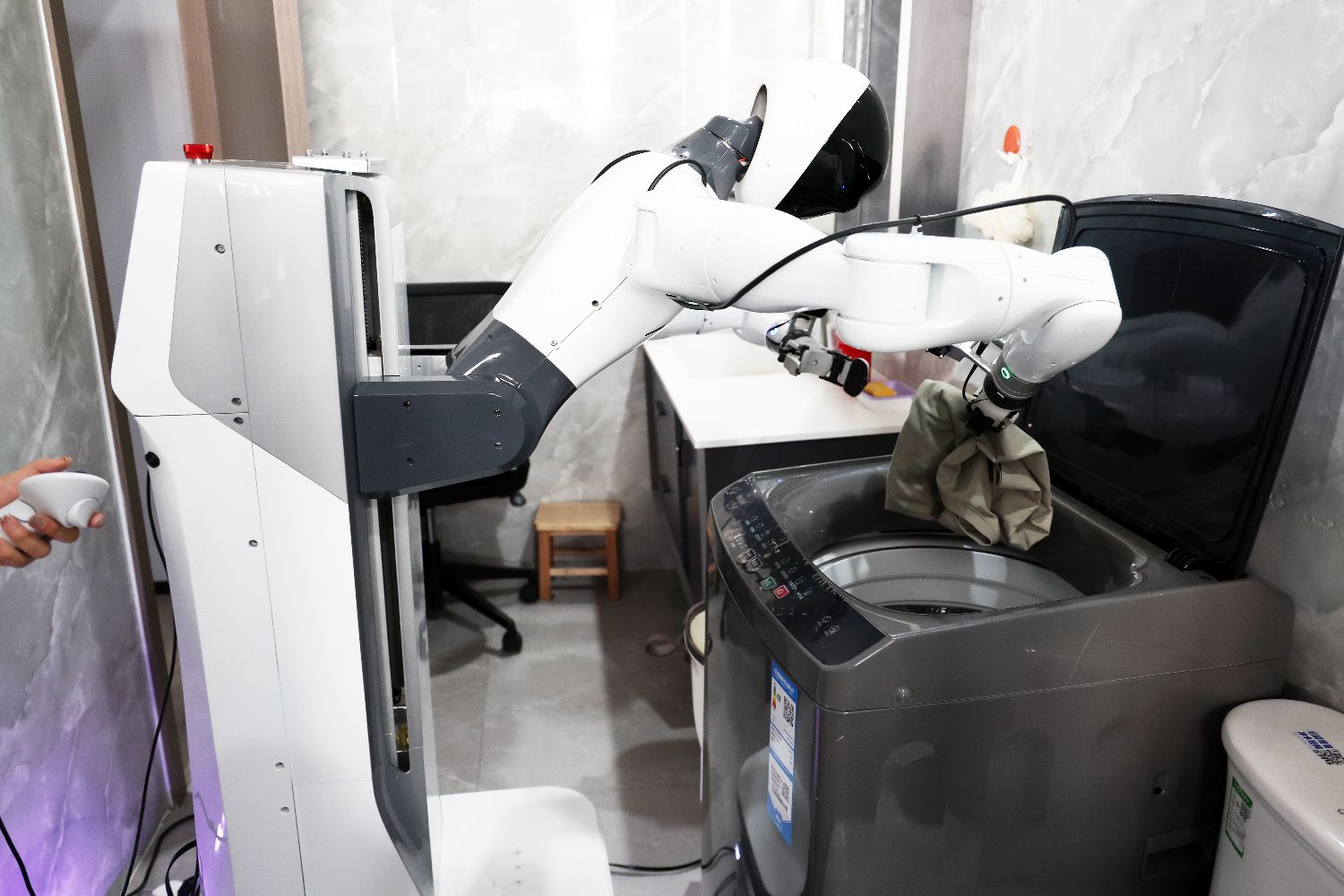 3月20日,在智元机器人张江数据采集中心内,人形机器人使用洗衣机。中新社