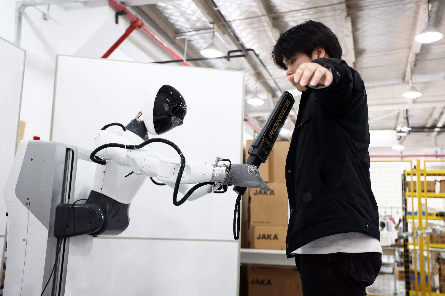 3月20日,在智元机器人张江数据采集中心内,工作人员正在训练人形机器人。中新社