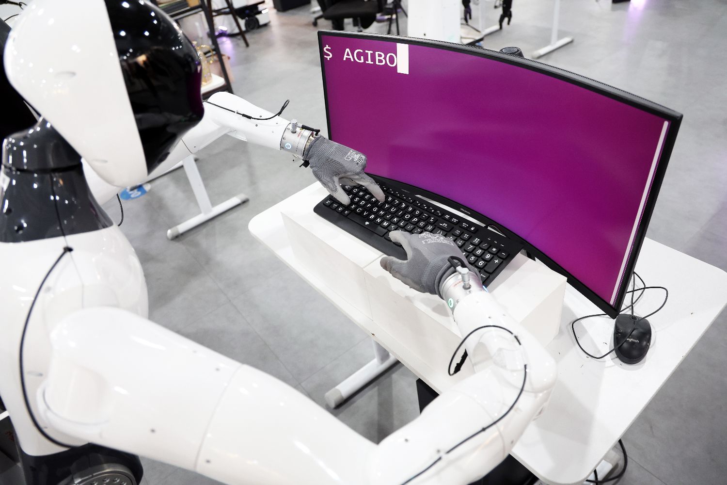 3月20日,在智元机器人张江数据采集中心内,人形机器人正在练习打字。中新社