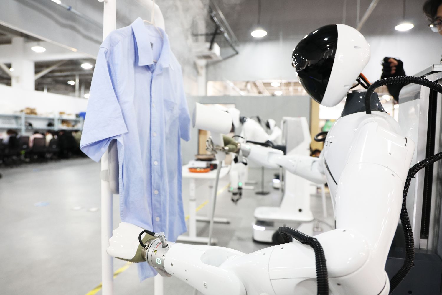 3月20日,在智元机器人张江数据采集中心内,人形机器人正在熨烫衣服。中新社