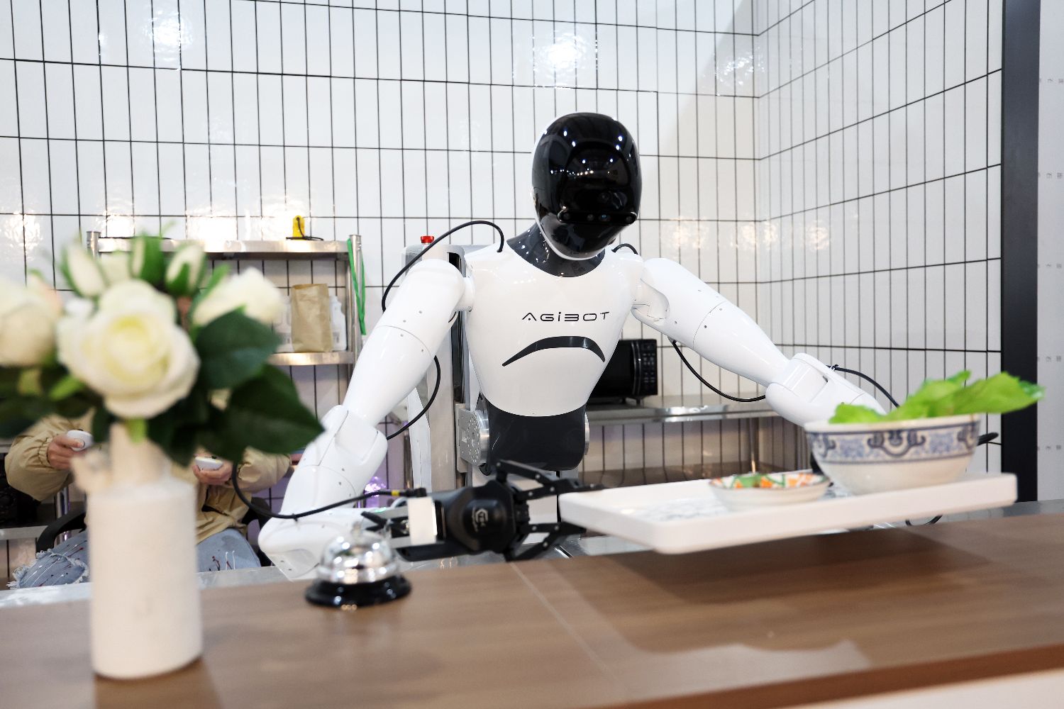 3月20日,在智元机器人张江数据采集中心内,人形机器人正在执行端菜任务。中新社