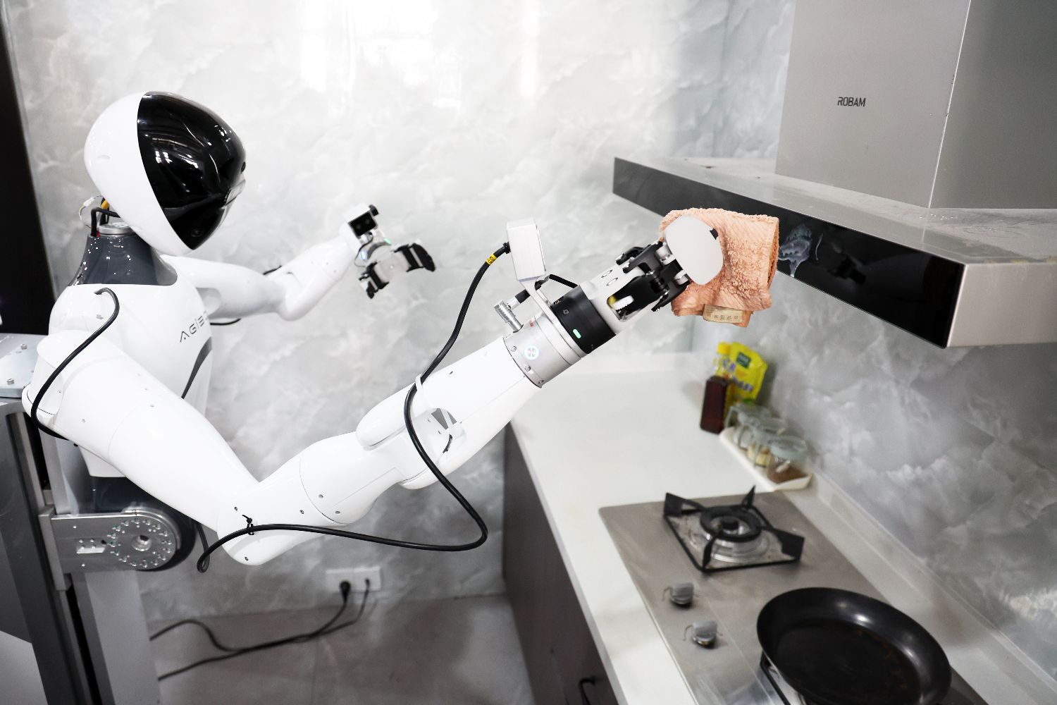 3月20日,在智元机器人张江数据采集中心内,人形机器人在厨房间执行清理任务。中新社