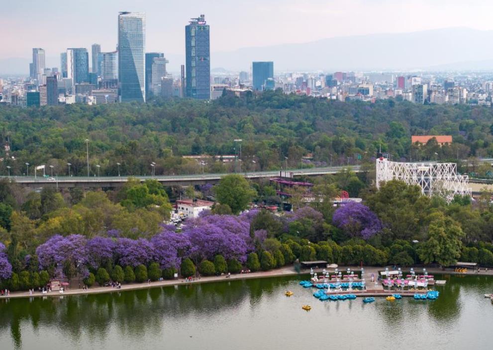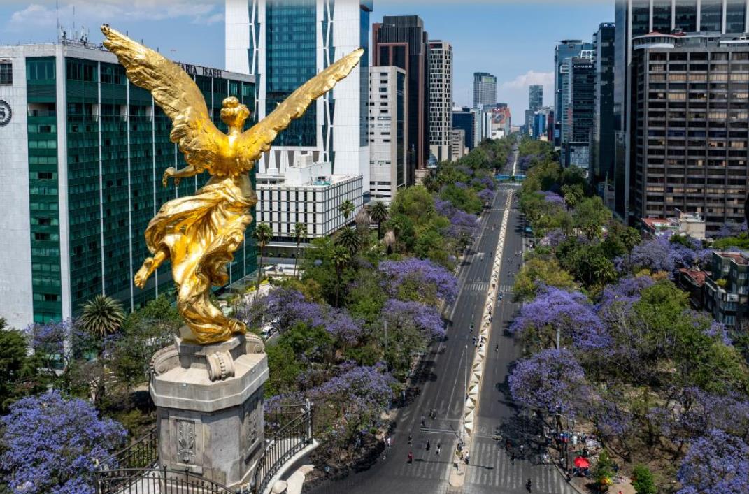 墨西哥城的蓝花楹是春天最具代表性的景观之一。每年3月至4月,这种紫蓝色花朵将城市街道、公园和广场点缀得如诗如画。图为3月23日,墨西哥首都墨西哥城盛开的蓝花楹和独立天使纪念碑。