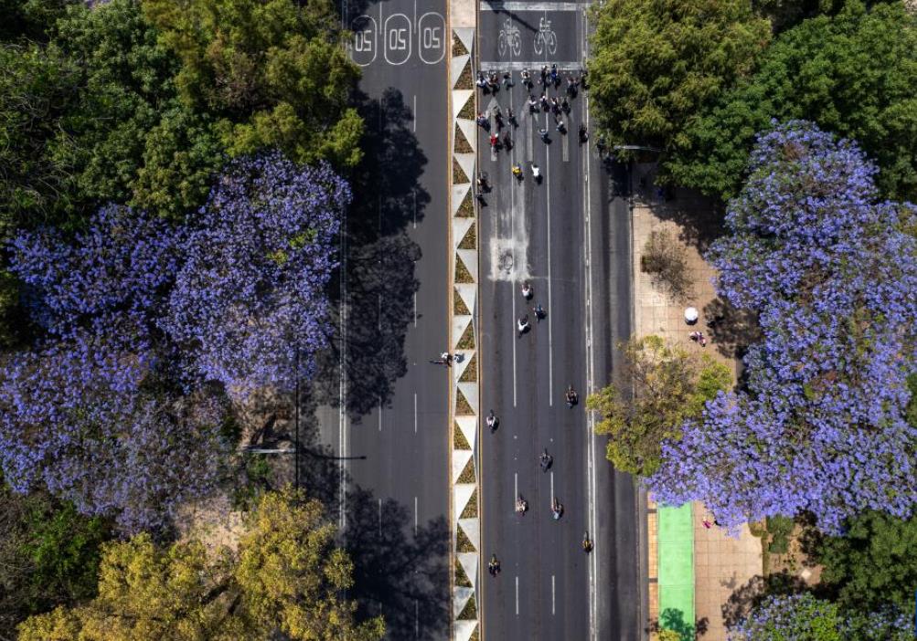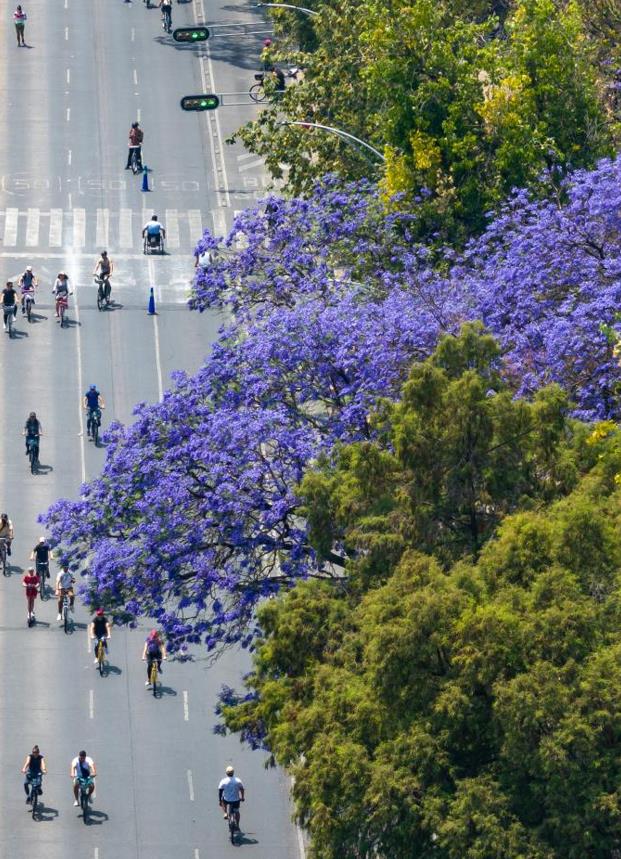 3月23日,在墨西哥首都墨西哥城,人们在改革大道盛开的蓝花楹下骑车。