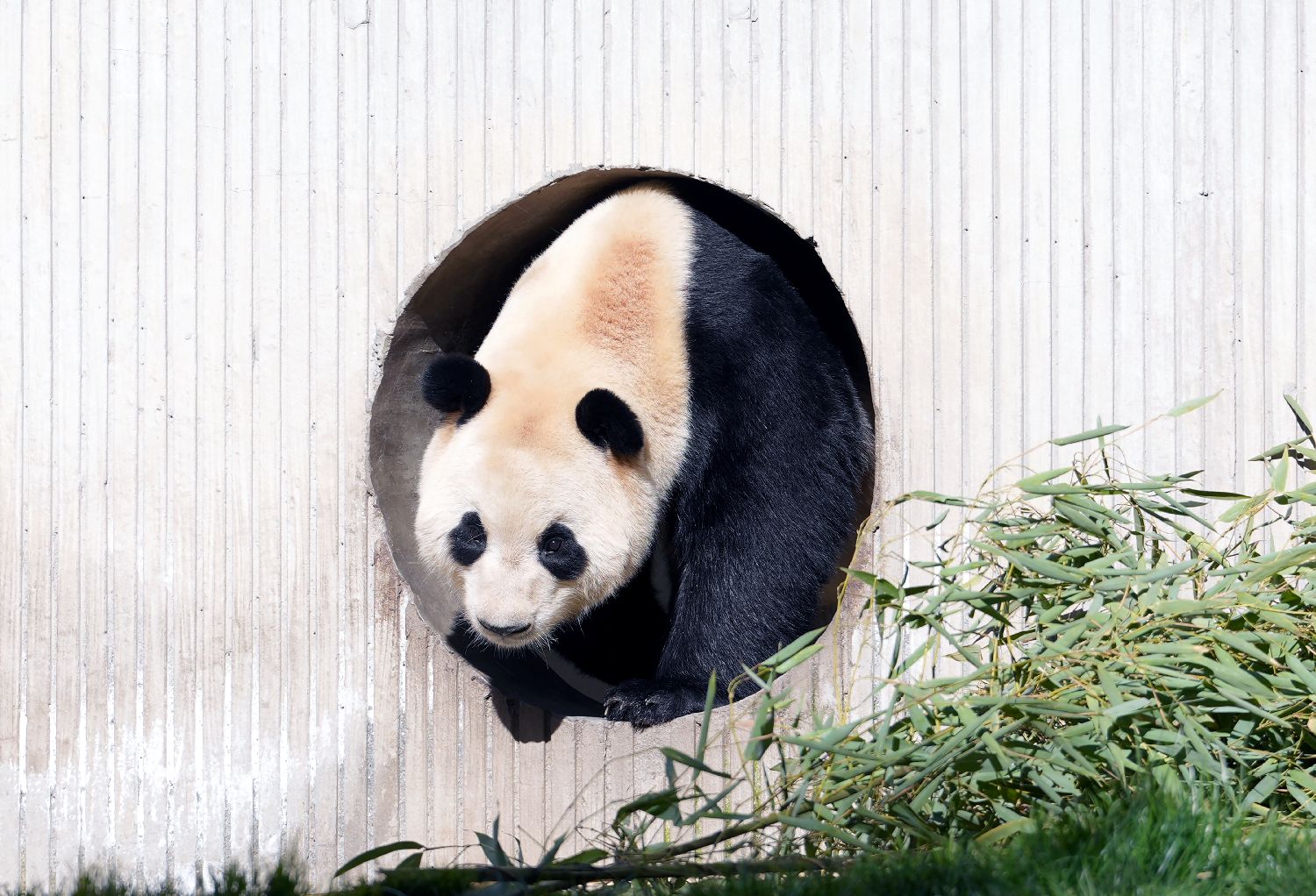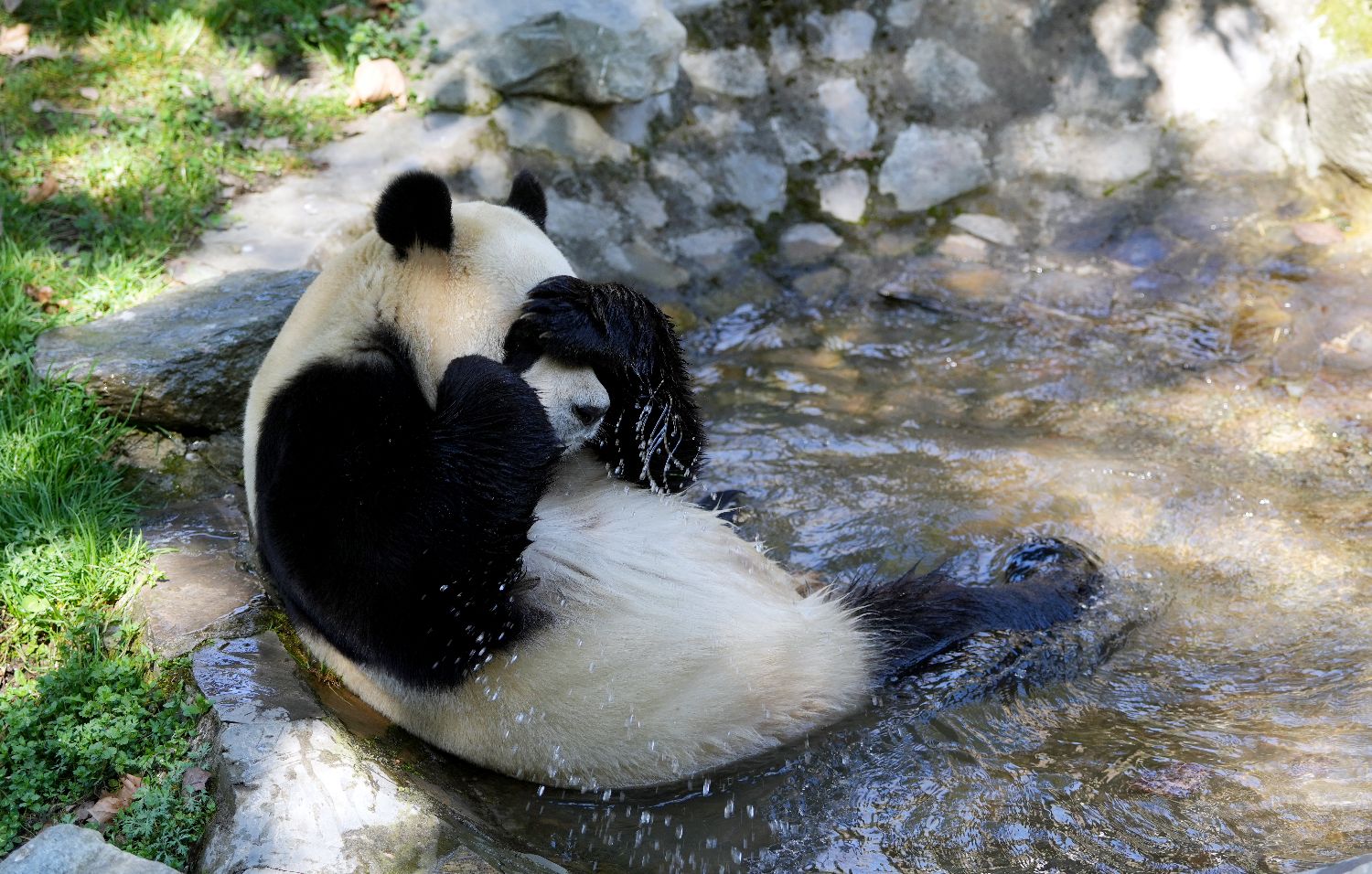 3月25日,大熊猫“福宝”在中国大熊猫保护研究中心卧龙神树坪基地幼儿园2号馆203圈舍复展。2024年12月,“福宝”因出现抖动转移至非展区监测、诊疗和静养。经过饲养员和兽医100余天的精心照料,目前,“福宝”精神、采食、活动均正常,顺利与公众再度见面。据专家组会诊,“福宝”的最新检测结果均未见异常。图为大熊猫“福宝”在水池玩耍。中新社