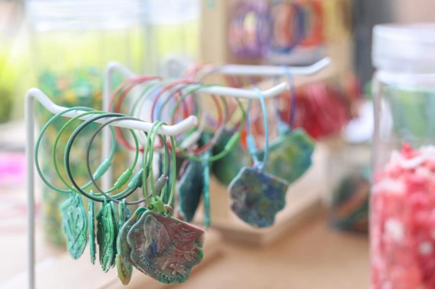 3月25日,博鳌亚洲论坛零碳休息区展示的使用废弃塑料制作的钥匙扣。新华社