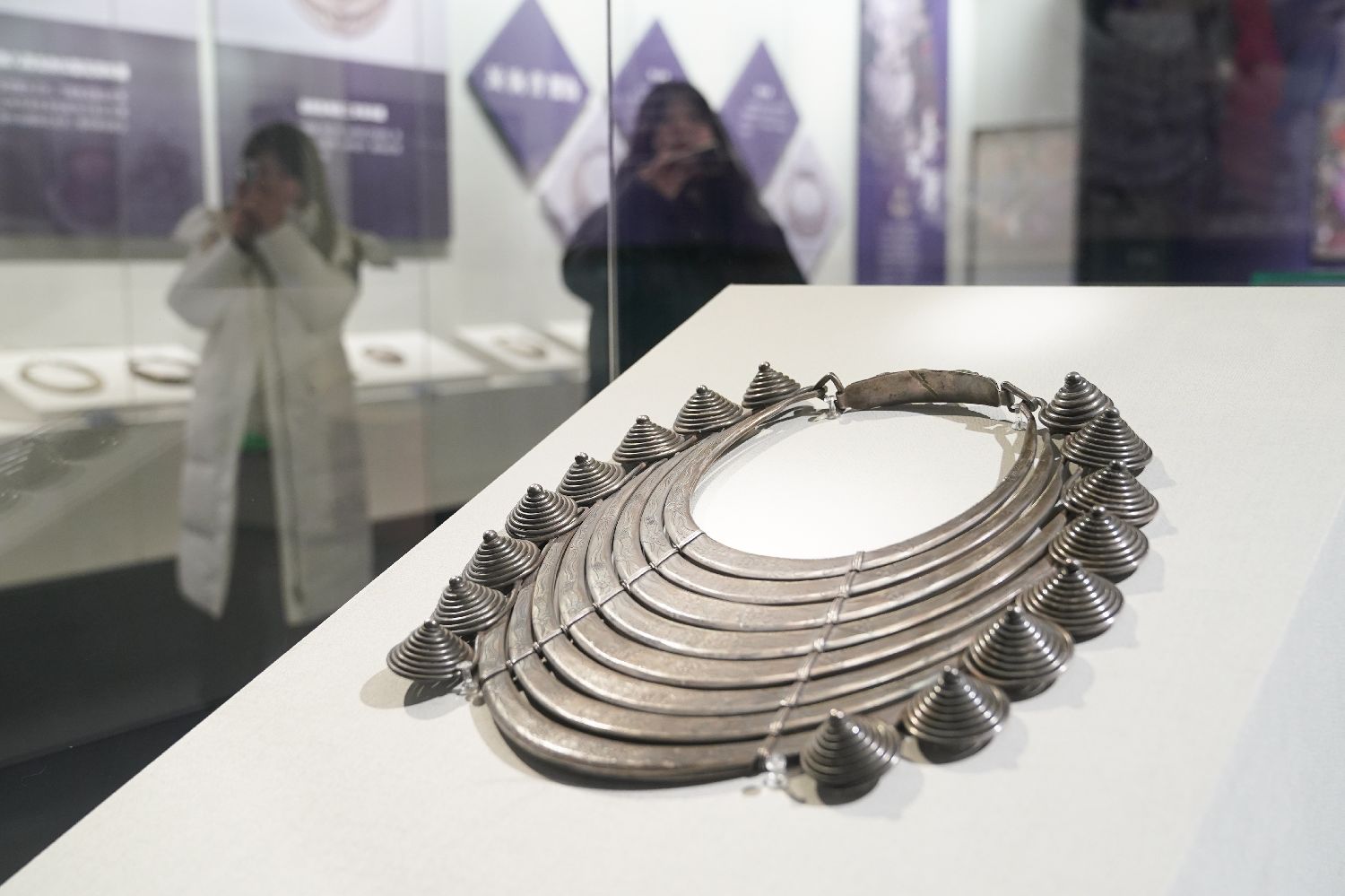 瑶族八排龙鱼纹錾花银项圈吸引市民。中新社