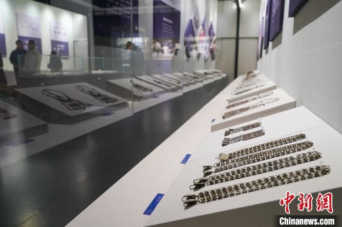展出的瑶族九方錾花银牌腰带(左)。中新网