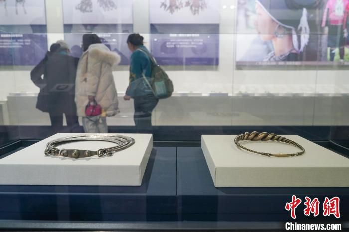 展出的侗族龙凤纹錾花三穿银项圈(左)、苗族绳纹银项圈。中新网