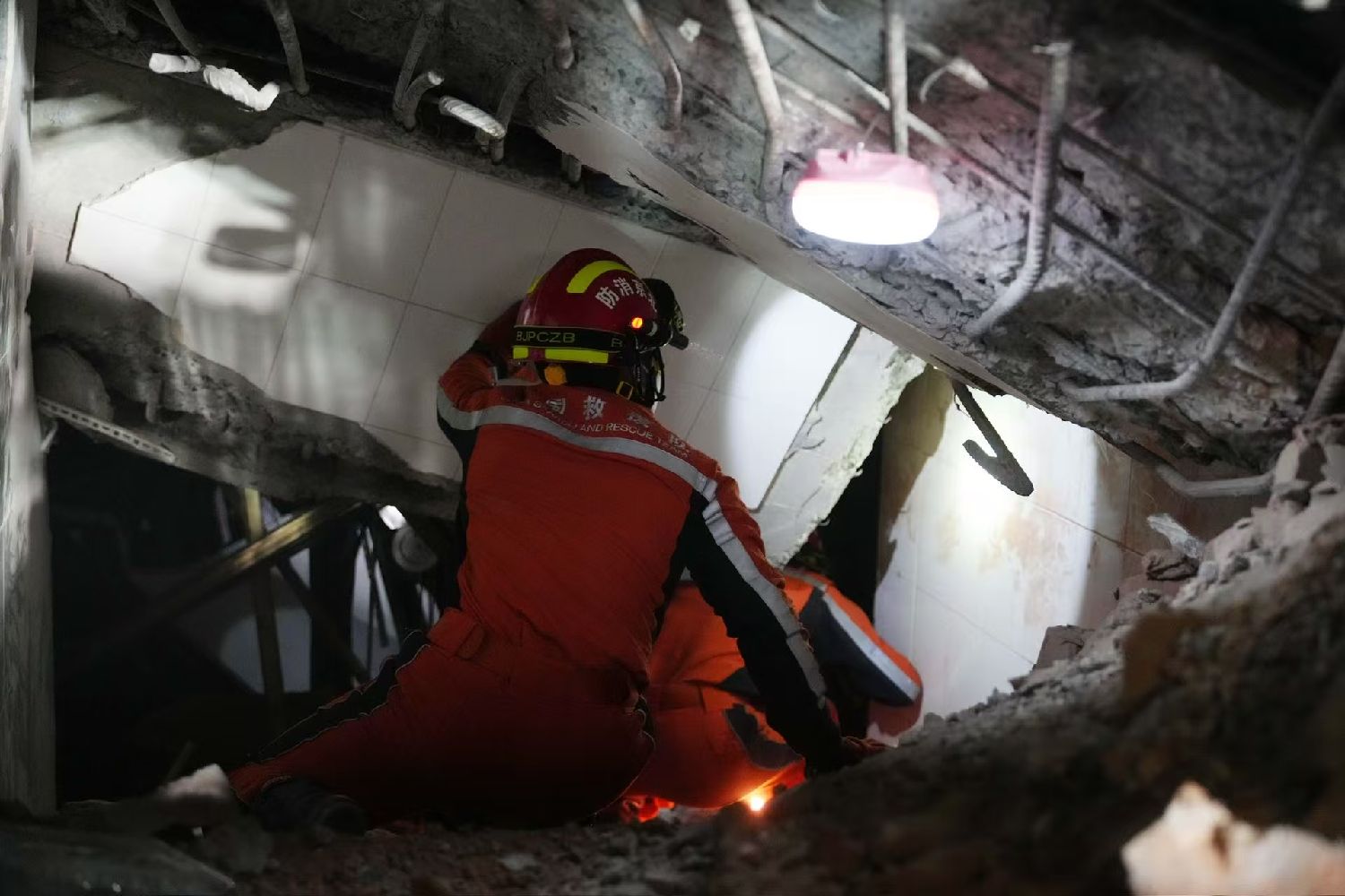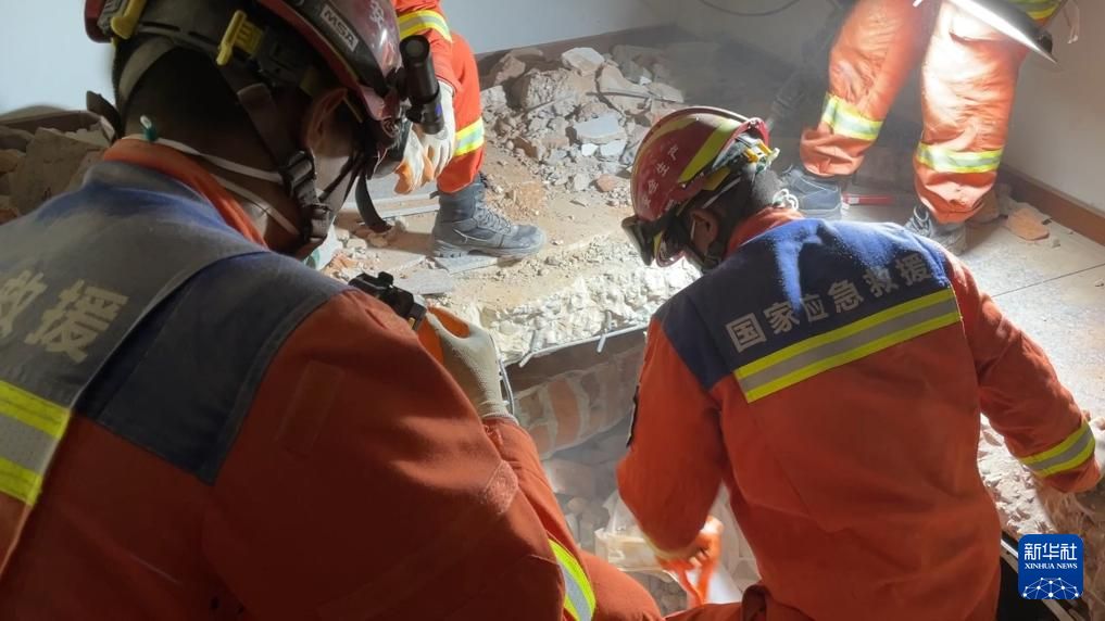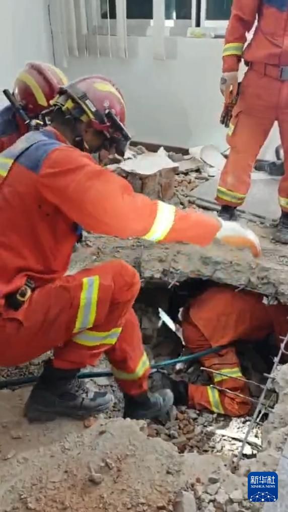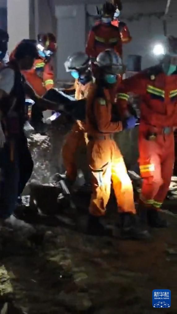 当地时间30日5时,经过连夜紧急救援,中国云南救援医疗队会同当地救援力量,在缅甸内比都一家医院的废墟下,救出1名已被困近40小时的老人。图为30日在缅甸内比都拍摄的救援现场(视频截图)。新华社发/云南广播电视台摄