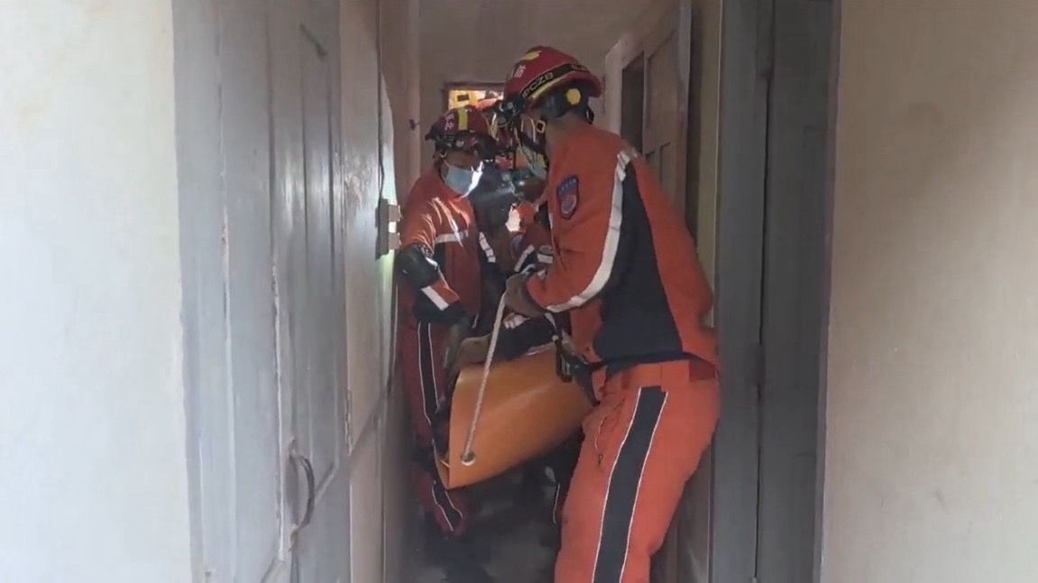 中国救援队在缅甸受灾严重的曼德勒市持续开展救援工作。图为31日7时许,中国救援队将一名被埋压超过65小时的29岁女性救出。新京报/应急管理部供图