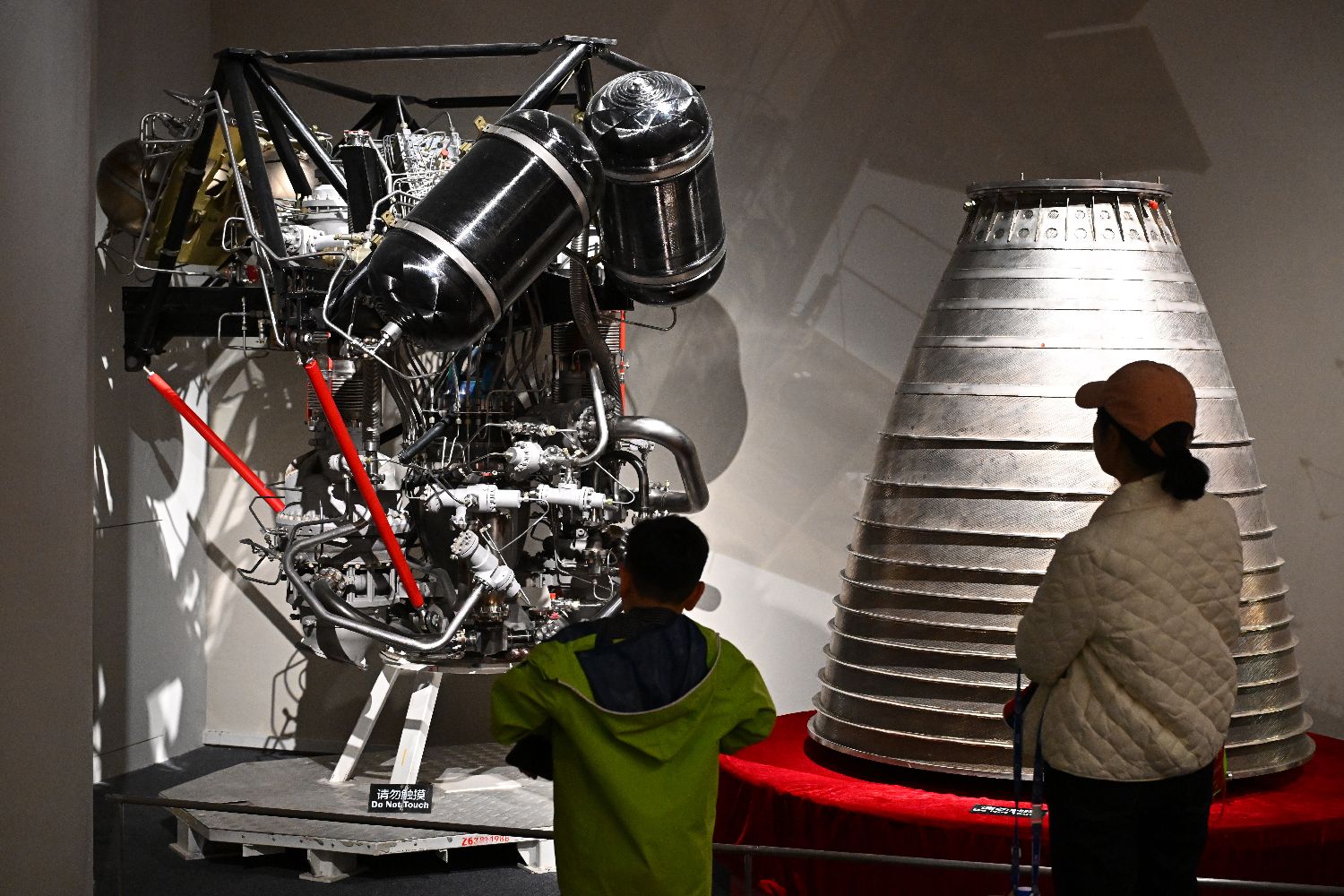 4月1日,家长带小朋友观看展出的YF-77发动机。中新社