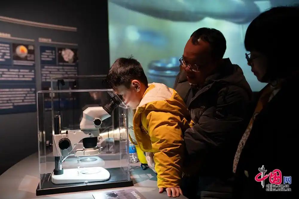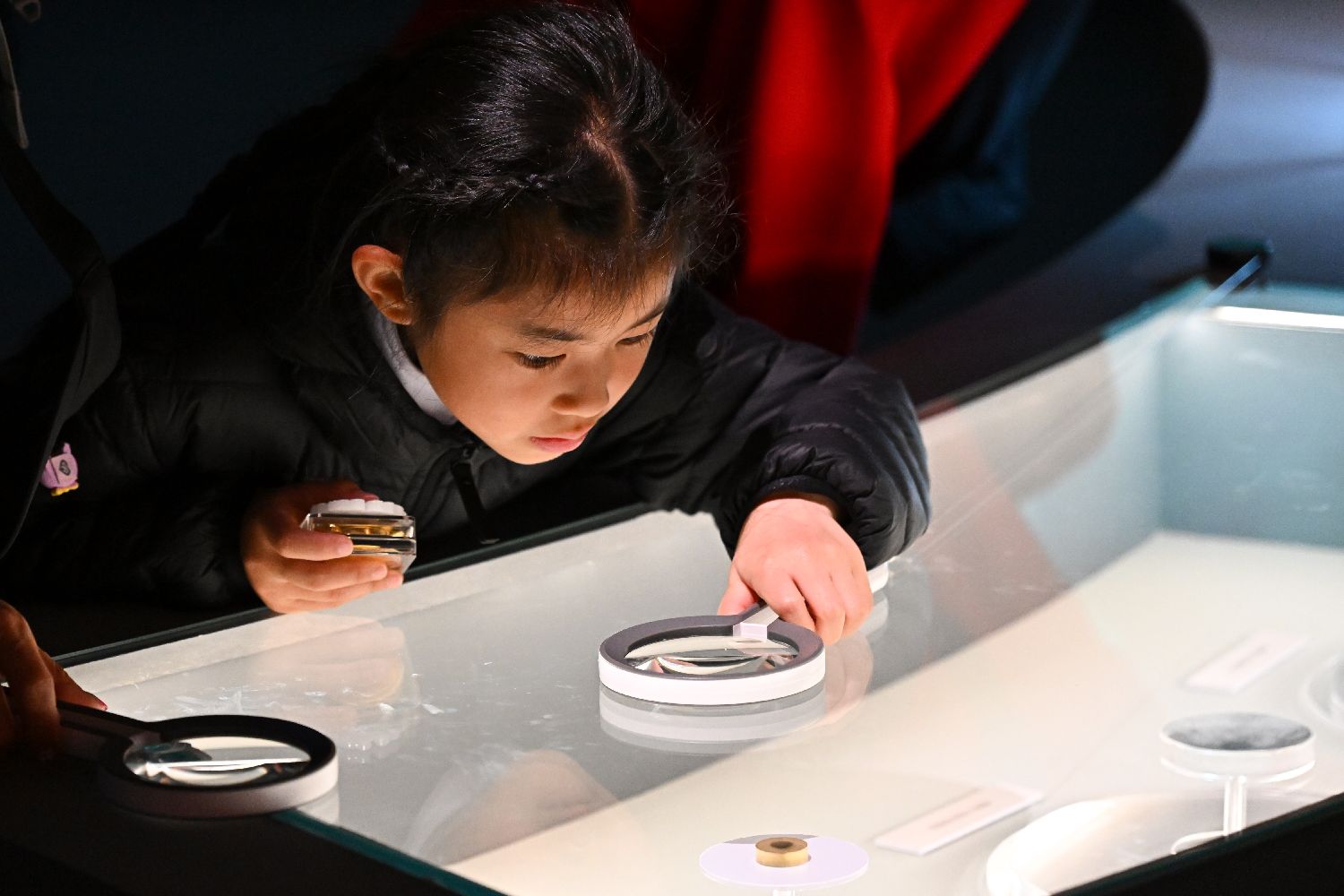 4月1日,小朋友通过放大镜观看展出的嫦娥六号样品光片。中新社