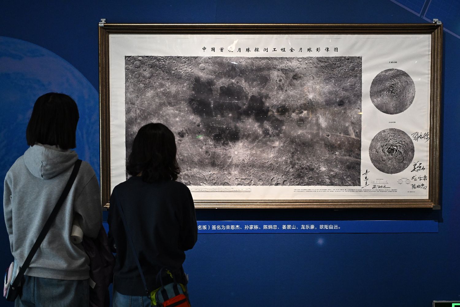 4月1日,参观者在观看展出的中国首次月球探测工程全月球影像图(签名版)。中新社