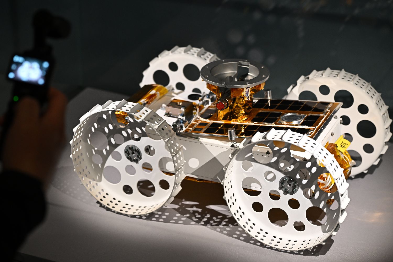 4月1日,参观者在拍摄展出的“金蟾号”智能机器人,该机器人是一个月面自主智能微小机器人,也是嫦娥六号配备的专属“摄影师”。中新社