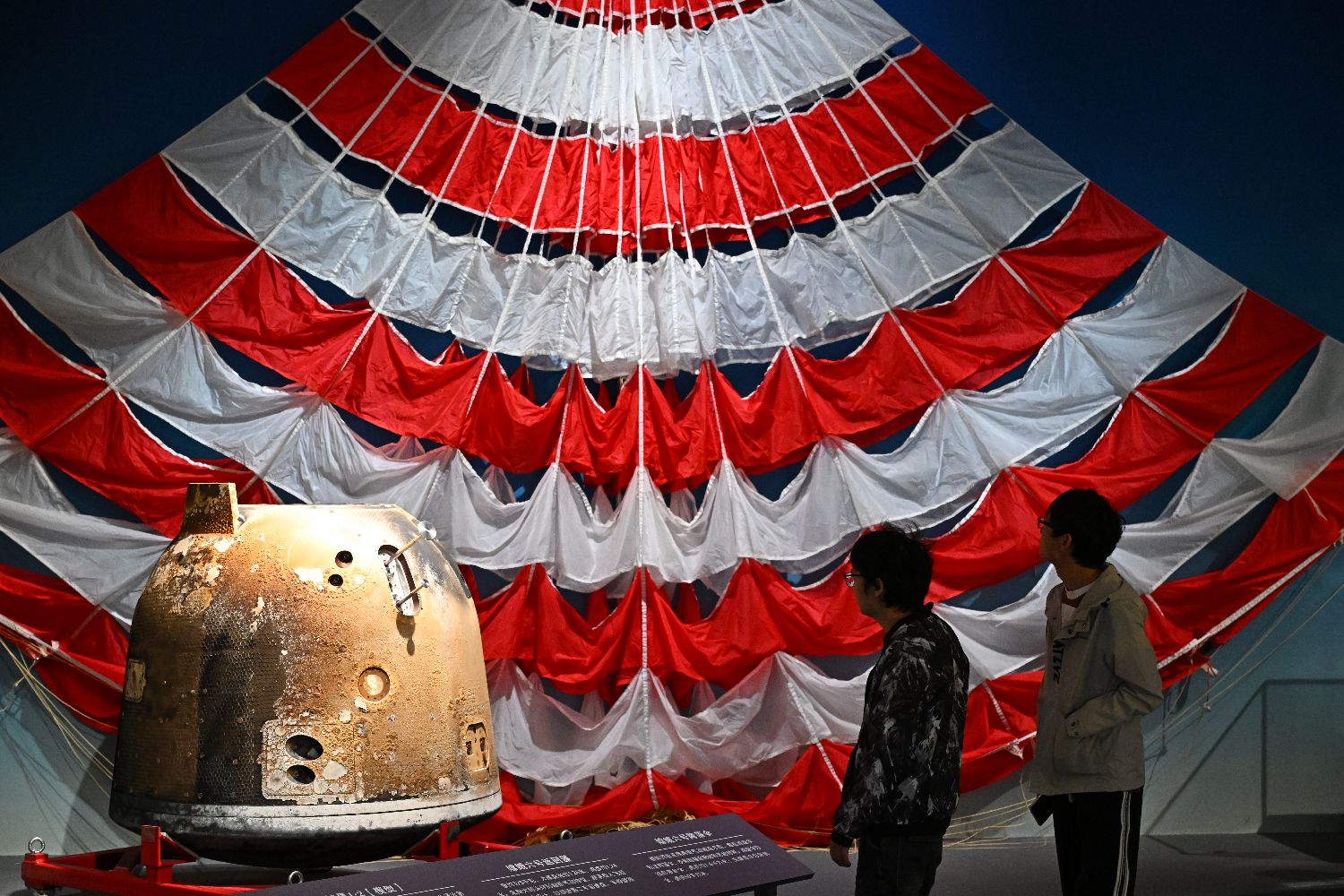 4月1日,参观者在观看嫦娥六号返回器(前)和嫦娥六号降落伞(后)。中新社