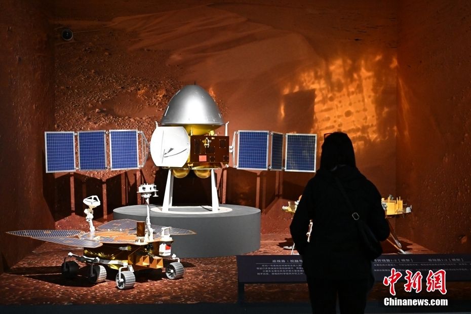 4月1日,参观者在观看展出的天问一号环绕器模型(中)。中新网