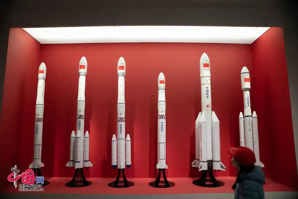 观众浏览探月任务中使用的各型火箭。从左到右依次为长征三号甲、长征三号乙、长征三号丙、长征四号丙、长征五号、长征八号。中国网
