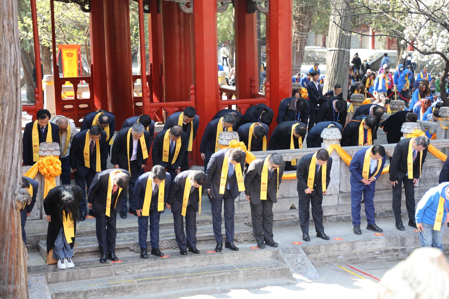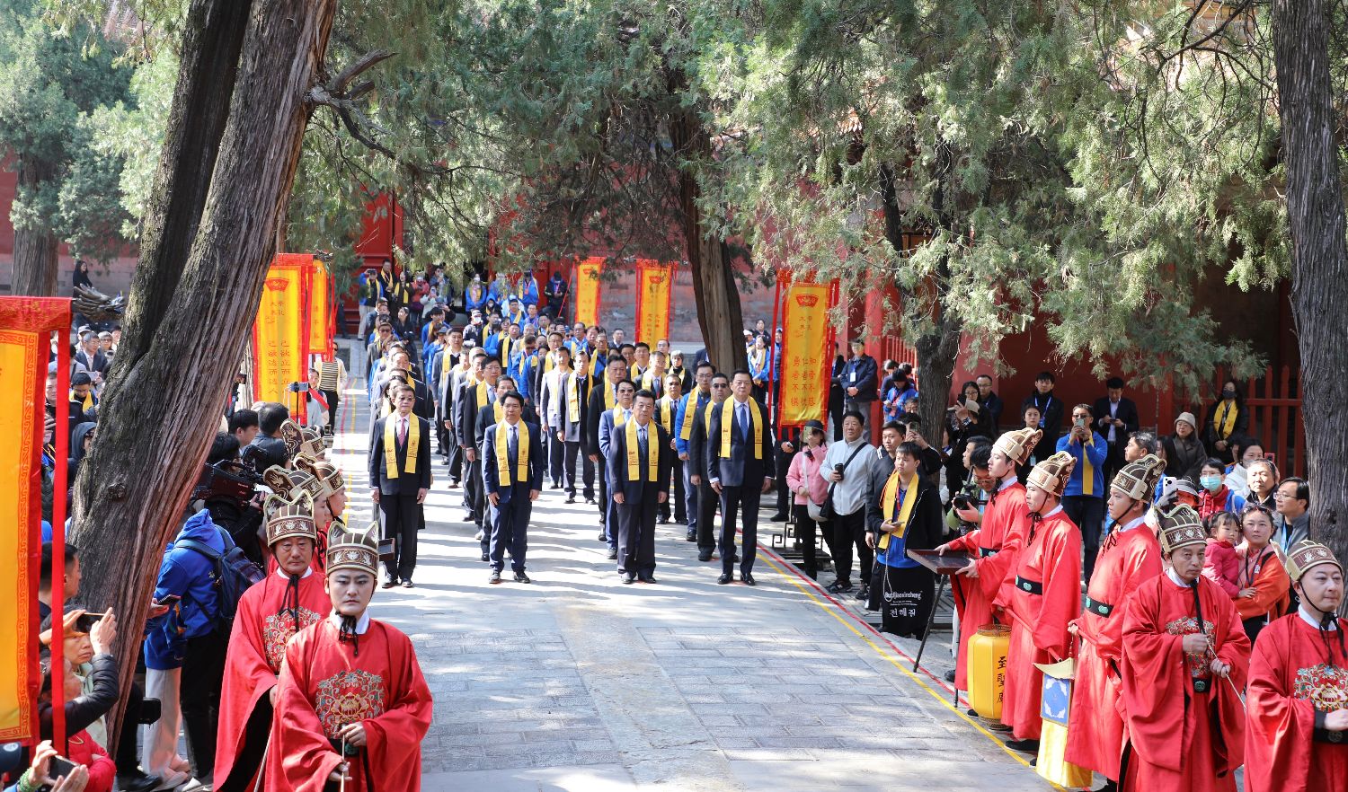 4月1日,2025海峡两岸孔子文化春会两岸青年同祭孔在山东曲阜孔庙举行。同日,2025海峡两岸孔子文化春会·礼乐嘉年华在山东曲阜启动。图为海峡两岸各界参祭人员在司礼官的引领下,缓步行至孔庙大成殿前。中新社