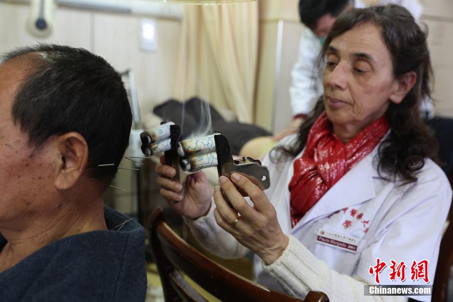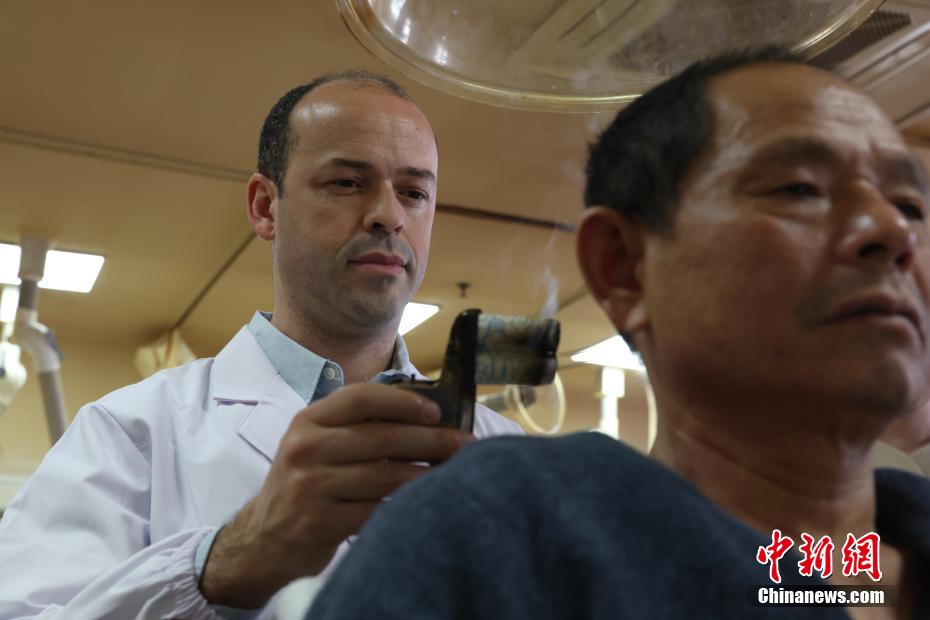 4月2日,江西中医药大学附属医院西湖院区,葡萄牙“洋中医”在门诊学习热敏灸技术。中新网