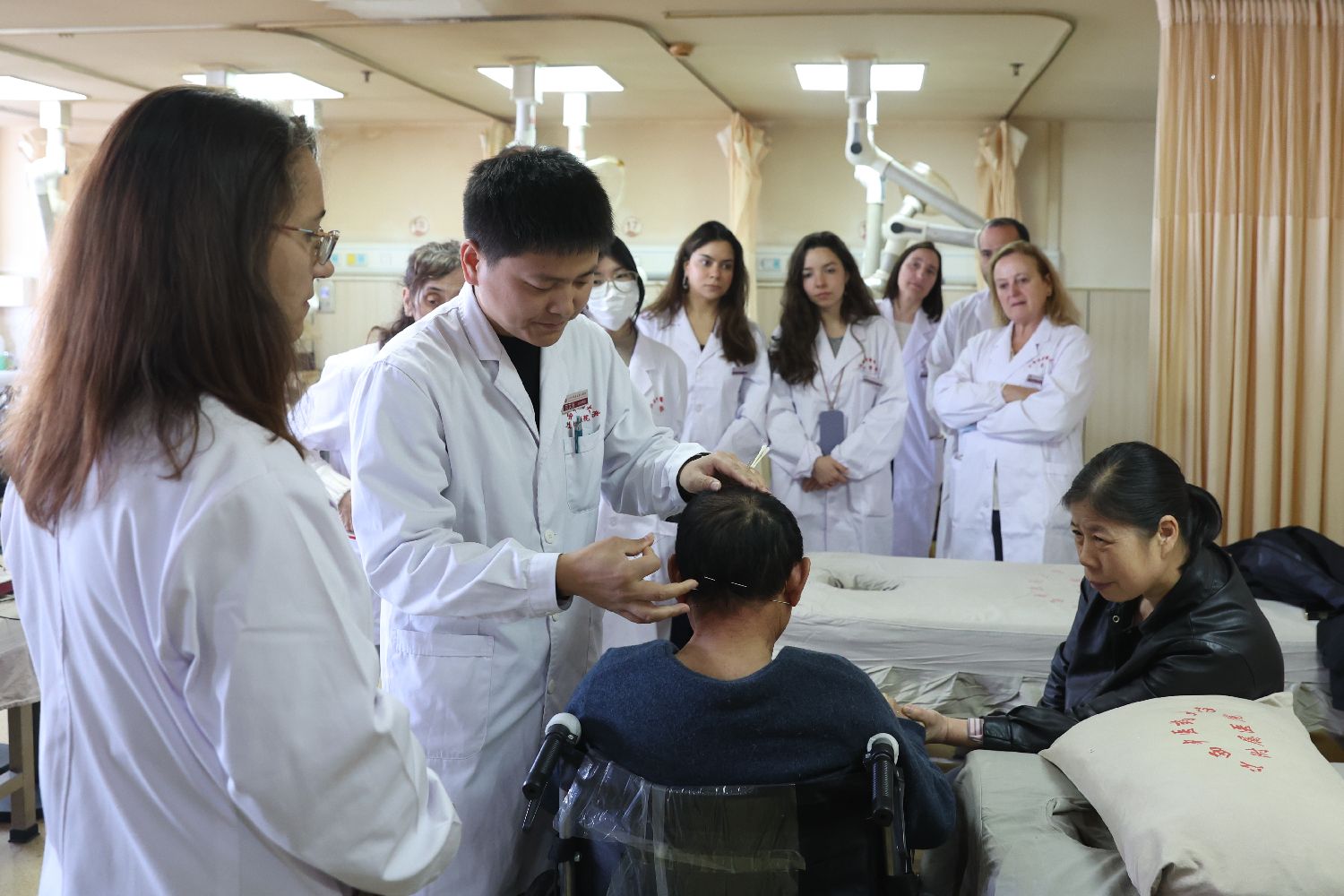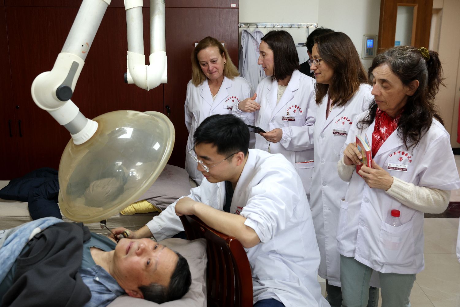 4月2日,江西中医药大学附属医院西湖院区,葡萄牙“洋中医”在门诊学习针灸技法。中新社