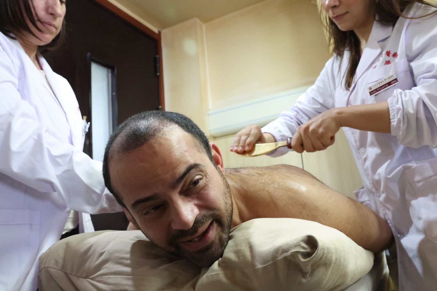 4月2日,江西中医药大学附属医院西湖院区,葡萄牙“洋中医”在此体验、学习刮痧等中医技法。中新社