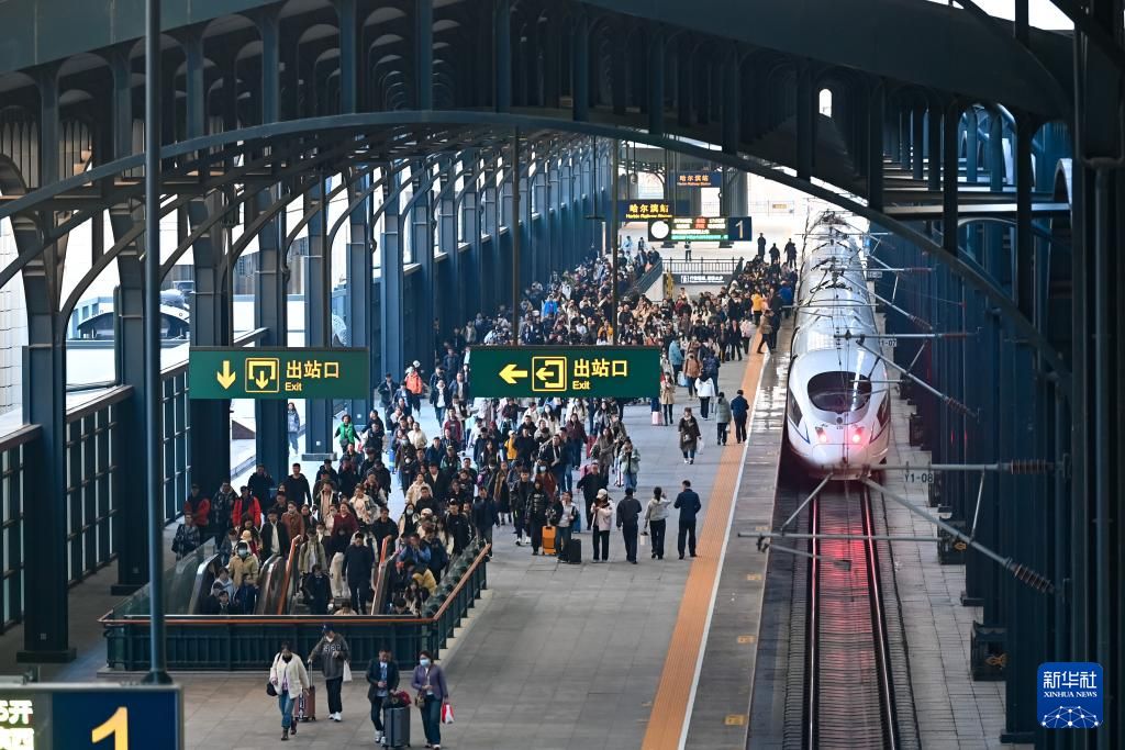 4月3日,旅客在黑龙江省哈尔滨站有序出行。新华社