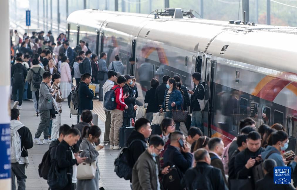 4月3日,在浙江省金华站站台上,旅客有序乘车。新华社