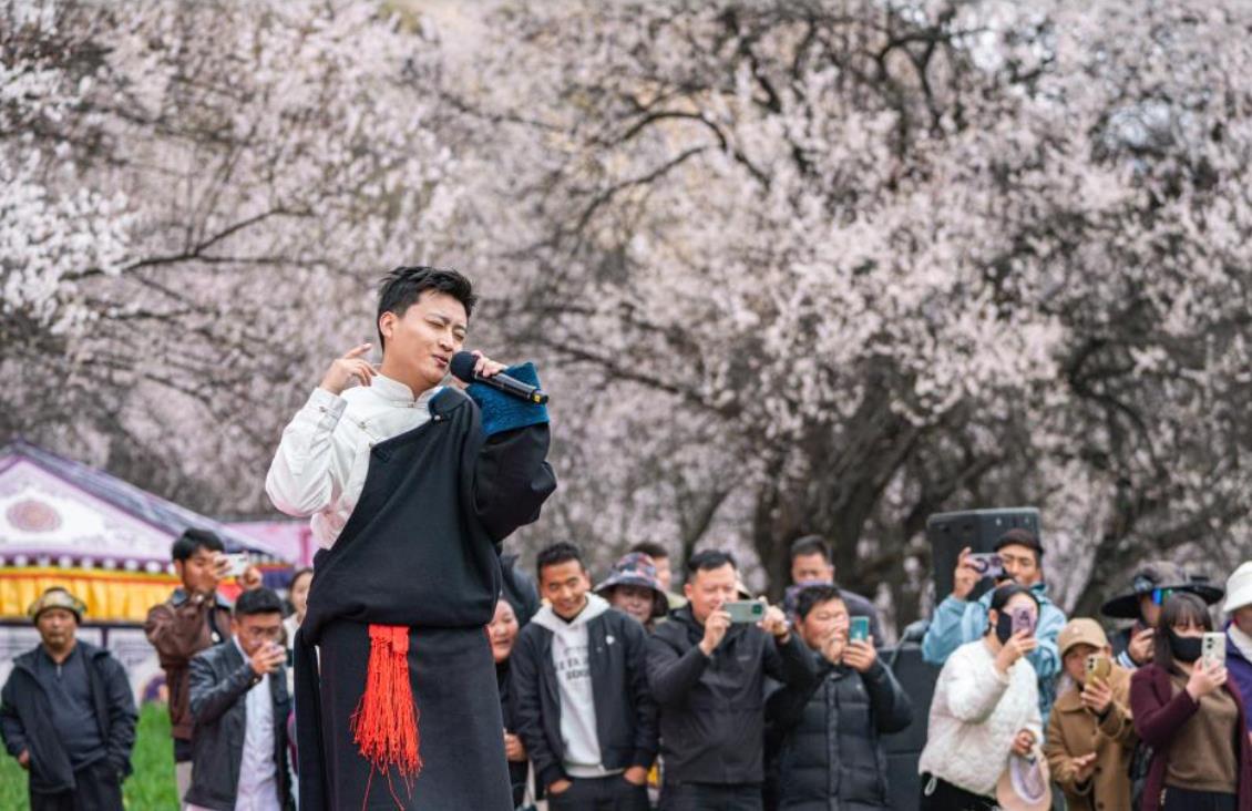 4月3日,林芝第二十二届桃花旅游文化节在西藏林芝工布公园开幕。此次桃花节为期一个月,将举办花车巡游、美食体验等20余项文旅活动,吸引八方游客感受“雪域江南”的独特魅力。图为4月3日,歌手在桃花旅游文化节巴宜区分会场现场演唱。