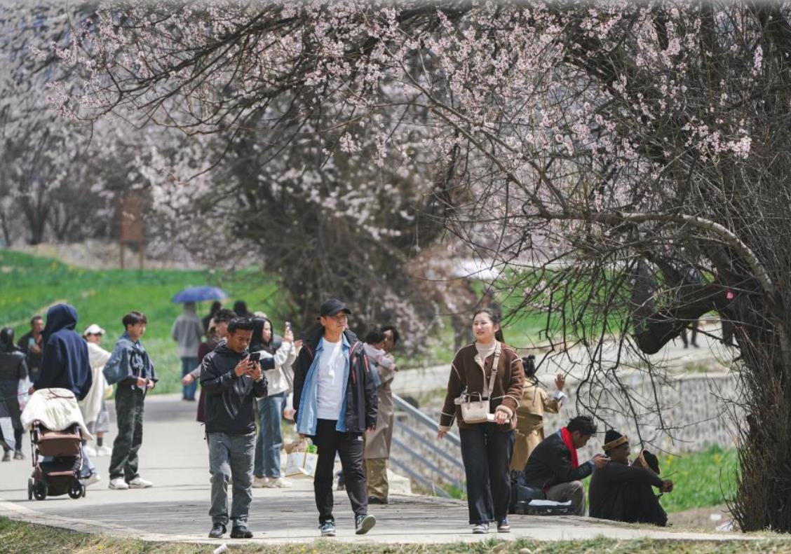 4月3日,游客在桃花旅游文化节巴宜区分会场朵当村观景游玩。