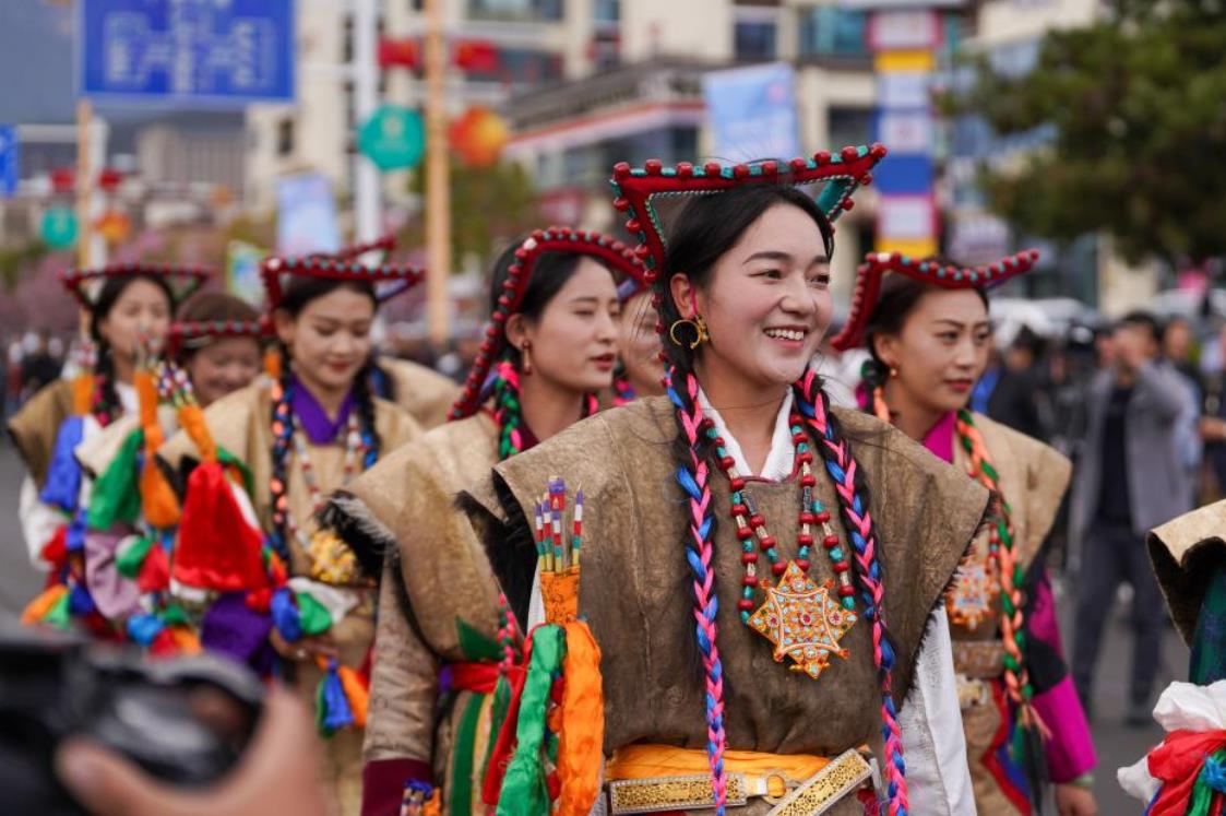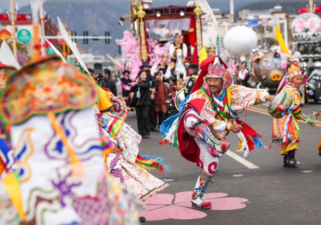 4月3日,演员在林芝桃花旅游文化节花车巡游活动中表演。