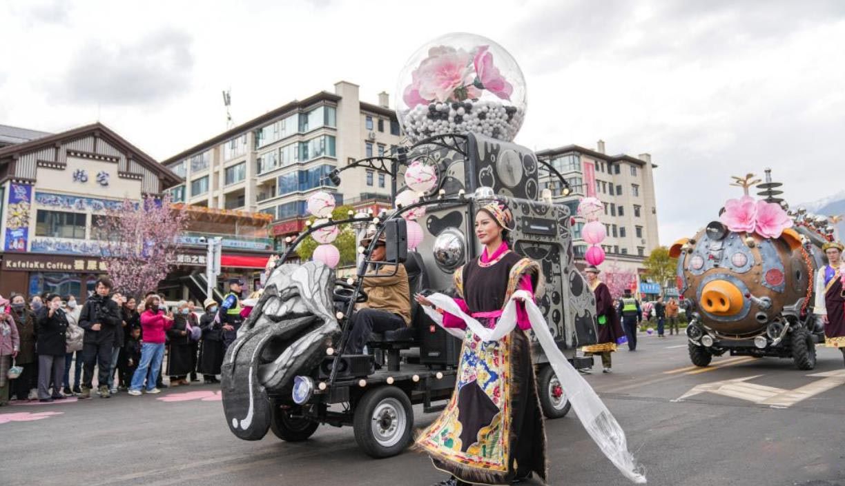 4月3日,林芝桃花旅游文化节花车巡游现场。