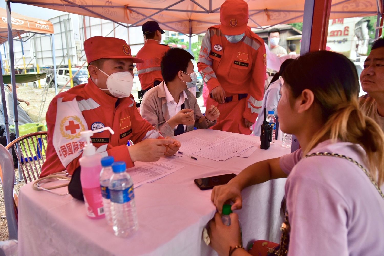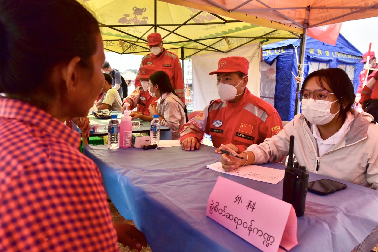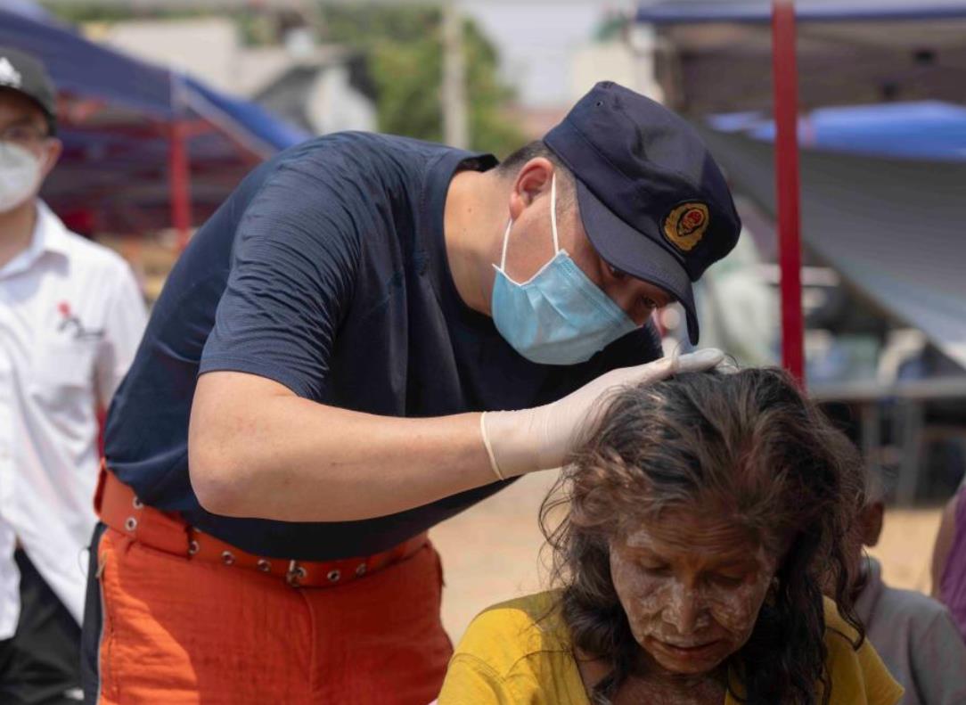 当地时间4月3日,在缅甸曼德勒一个灾民安置点,中国国际救援队医疗分队为当地民众提供免费检查及治疗。图为救援队队员为民众义诊。中新社/中国国际救援队供图