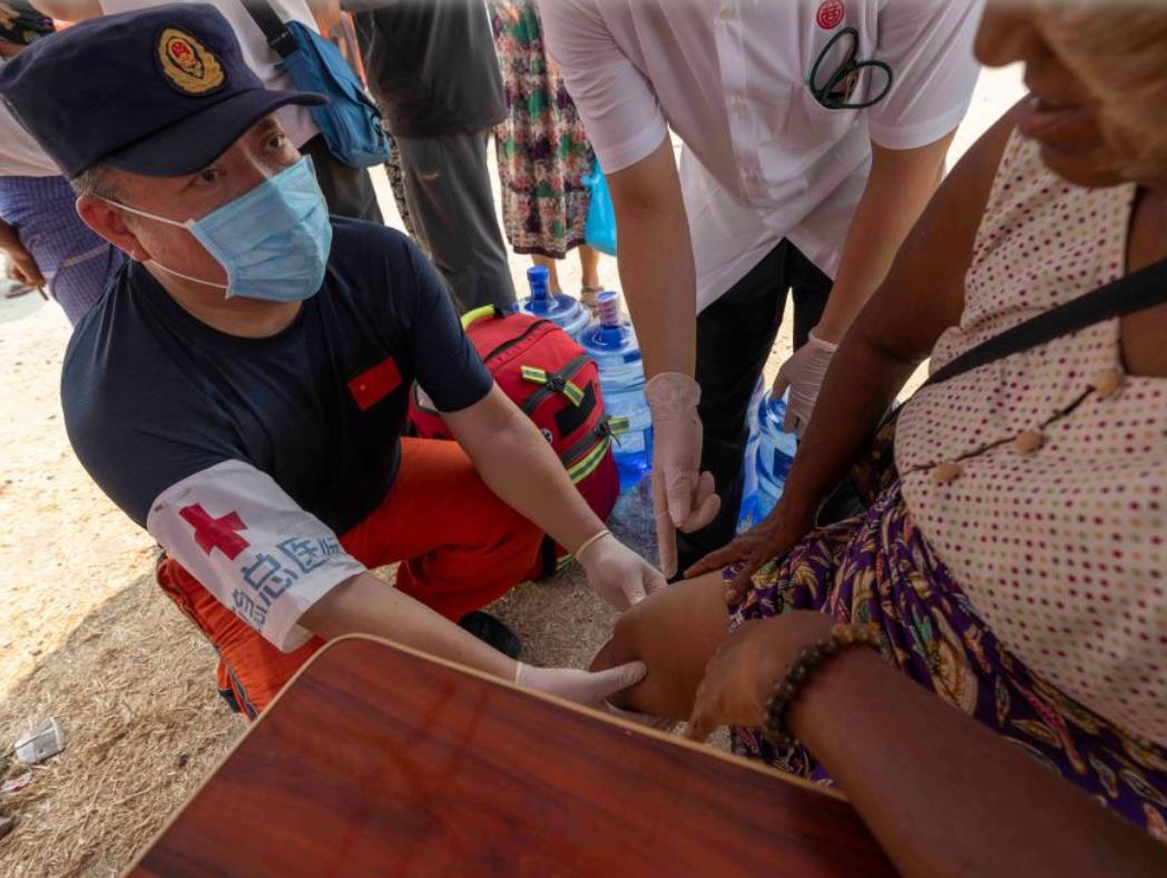 4月3日,在缅甸曼德勒医学院附近的一处安置点,中国救援队队员为一女子检查关节损伤情况。新华社