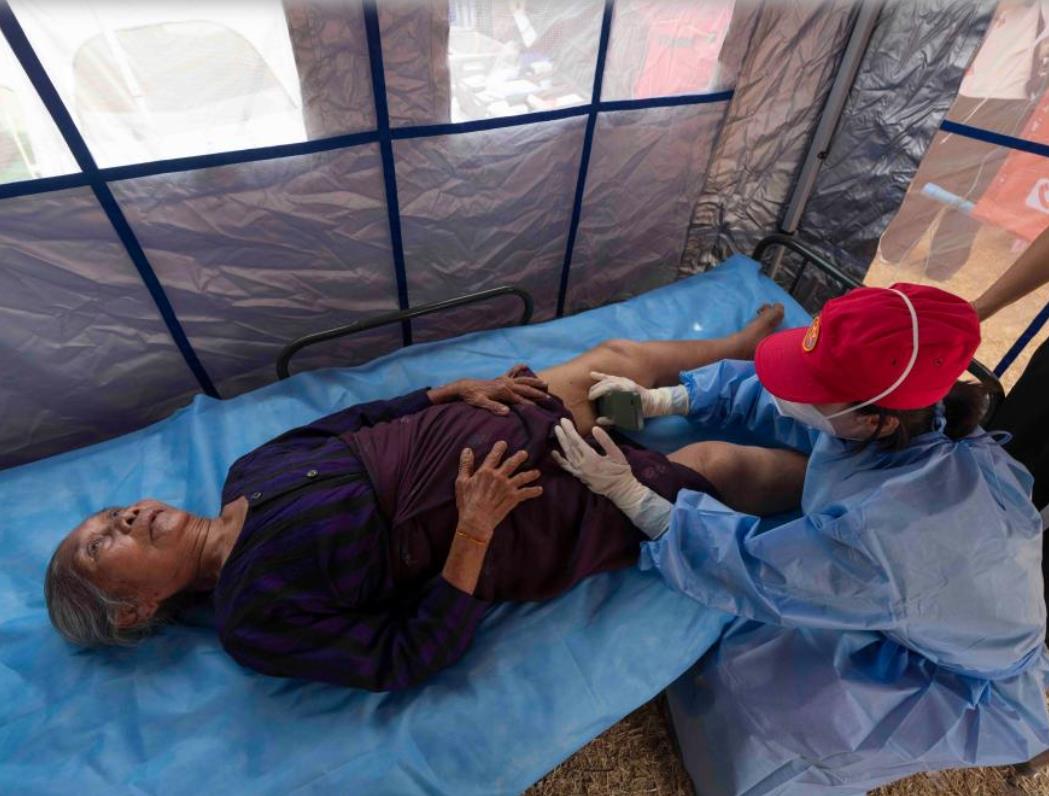 4月3日,在缅甸曼德勒医学院附近的一处安置点,由中国军队参与组派的中国国际救援队队员用掌上超声仪为一位老者做检查。新华社