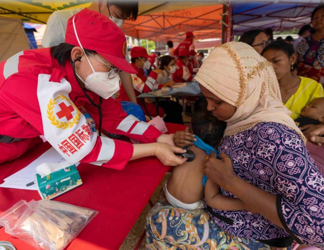 4月3日,在缅甸曼德勒医学院附近的一处安置点,由中国军队参与组派的中国国际救援队队员为一名儿童听诊。新华社
