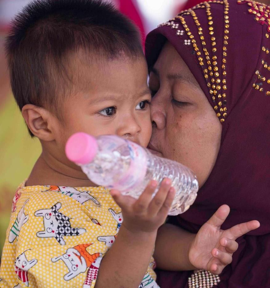 4月3日,在缅甸曼德勒医学院附近的一处安置点,一名女子带着孩子就诊。新华社