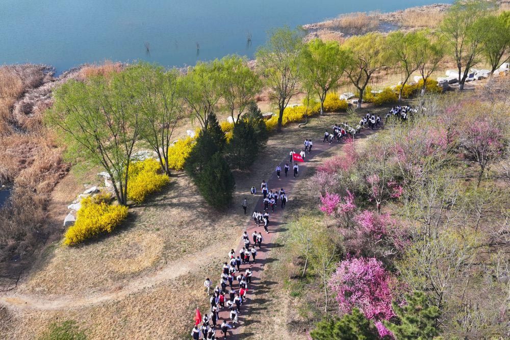 4月3日,山东高密第五中学的中学生在胶河国家湿地公园参加踏青远足活动。
