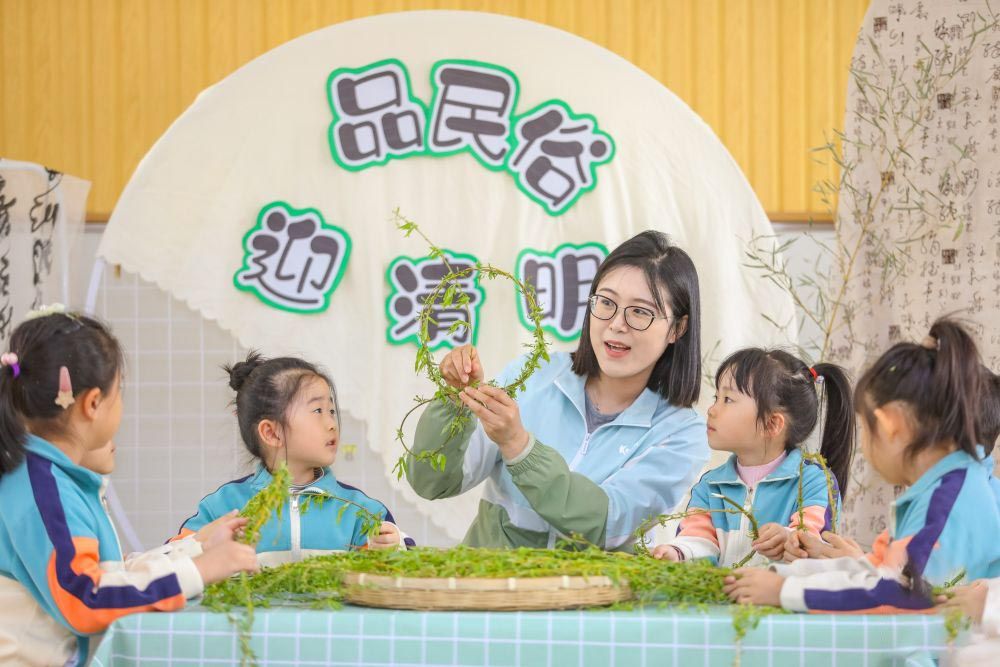 4月2日,在山东青岛李沧区青峰路幼儿园开展的迎清明活动中,老师指导小朋友编柳帽。